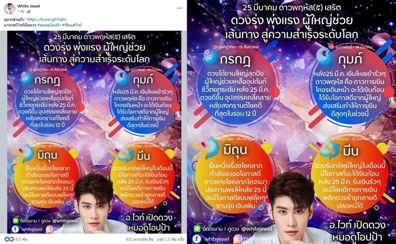 จากกรณี หมอดูชื่อดังอย่าง อ.ไวท์ หมอดูโอปป้า เปิดดวง 4 ราศี ดาวรุ่ง พุ่งแรง ผู้ใหญ่ช่วย เส้นทาง สู่ความสำเร็จระดับโลก 25 มีนาคม ดาวพฤหัส(๕) เสริด