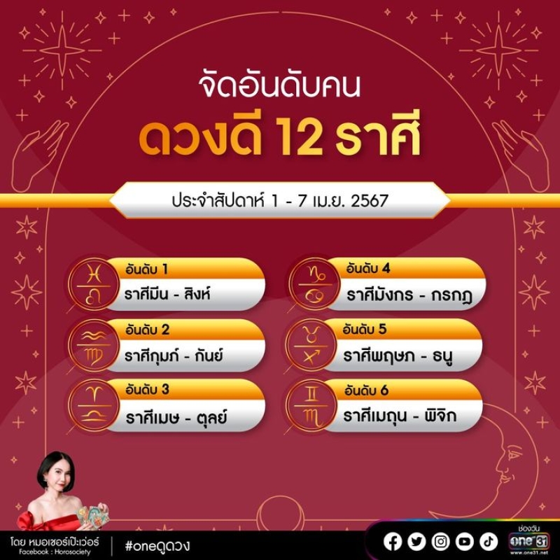 วันที่ 1 เม.ย. 67 ที่ผ่านมา Horosociety หมอเชอร์ เป๊ะเว่อร์ นักโหราศาสตร์ชื่อดังและดูดวงได้จัดอันดับคนดวงดี 12 ราศี ประจำสัปดาห์ที่ 1 - 7 เม.ย. 67