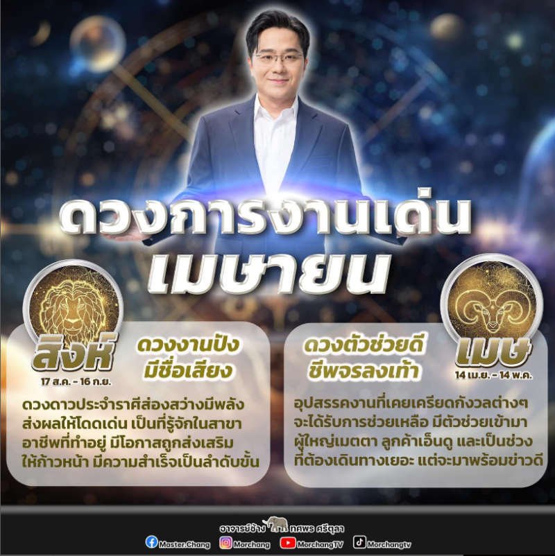 ดวงงานปัง มีชื่อเสียง ดวงดาวประจำราศีส่องสว่างมีพลัง ส่งผลให้โดดเด่น เป็นที่รู้จักในสาขาอาชีพที่ทำอยู่ มีโอกาสถูกส่งเสริมให้ก้าวหน้า มีความสำเร็จเป็นลำดับขั้น