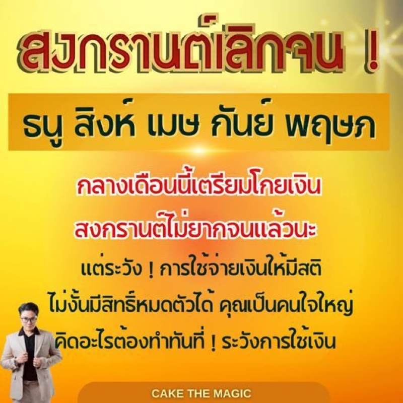 หมอเค้ก เดอะเมจิก ได้ทำนายดวงชาว 5 ราศี ในช่วงนี้ โดยหมอเค้กว่า สงกรานต์เลิกจน อ พร้อมระบุว่า กลางเดือนนี้เตรียมโกยเงิน สงกรานต์ไม่ยากจนแล้วนะ แต่ระวังการใช้จ่ายเงินให้มีสติ ไม่งั้นมีสิทธิหมดตัวได้ คุณเป็นคนใจใหญ่ คิดอะไรต้องทำทันที! ระวังการใช้เงิน