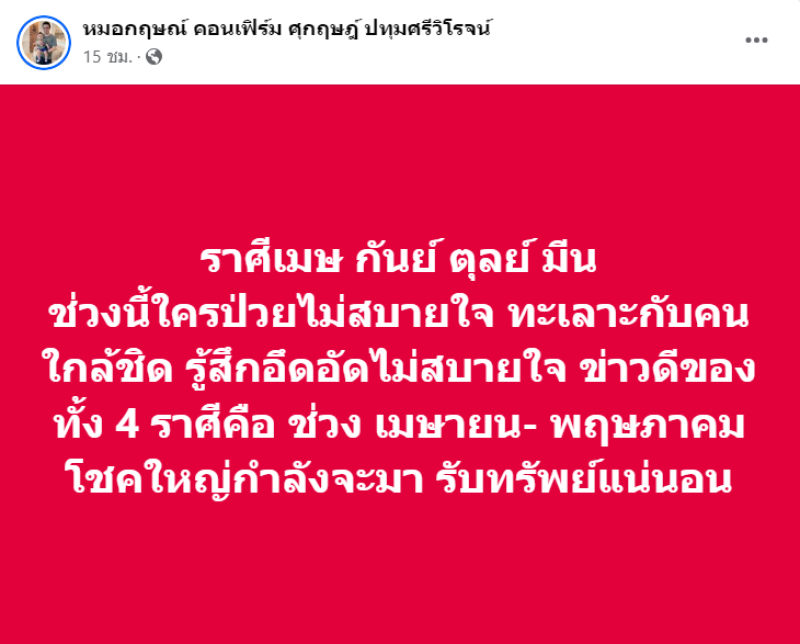 วันที่ 16 เม.ย. 67 ที่ผ่านมา หมอกฤษณ์ ศุกฤษฎ์ ปทุมศรีวิโรจน์ นักโหราศาสตร์ชื่อดัง อันดับต้นๆของประเทศ ได้ออกมาทำนายดวงชะตา 4 ราศี ช่วง เมษายน- พฤษภาคม โชคใหญ่กำลังจะมา รับทรัพย์แน่นอน