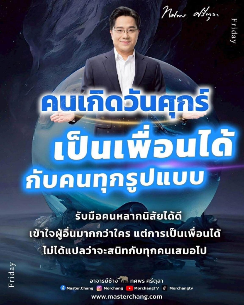 เรียกได้ว่า หลายคนคงรู้จัก กับ อาจารย์ช้าง ทศพร ศรีตุลา นักโหราศาสตร์ชื่อดัง ได้เผยข้อมูลเกี่ยวกับนิสัยของผู้ที่เกิดวันศุกร์ เน้นถึงความสามารถในการเข้าสังคม และ ปรับตัวเข้ากับคนรอบข้างอย่างเป็นธรรมชาติ
