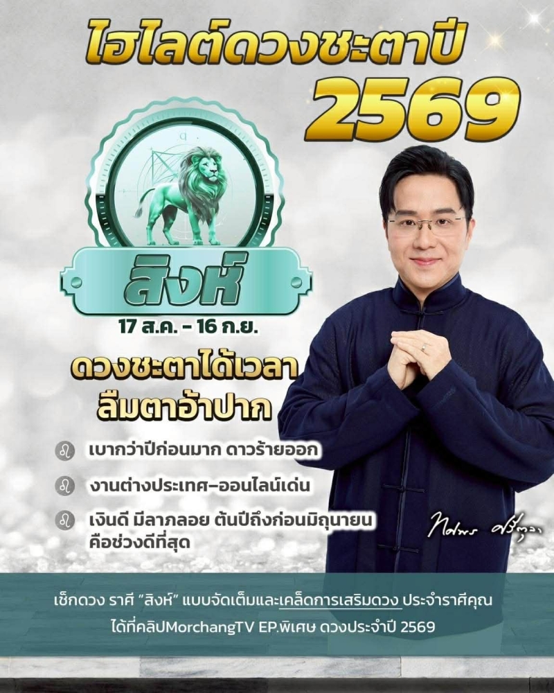 เรียกได้ว่า ดวงชะตาปี 2569 ของชาวราศีสิงห์ (17 ส.ค.-16 ก.ย.) ถูกจับตามองไม่น้อย เมื่อ หมอช้าง ทศพร ศรีตุลา ออกมาพยากรณ์ภาพรวมว่าเป็นปีแห่งการฟื้นตัว หลังผ่านช่วงหนักหน่วงมาพอสมควร