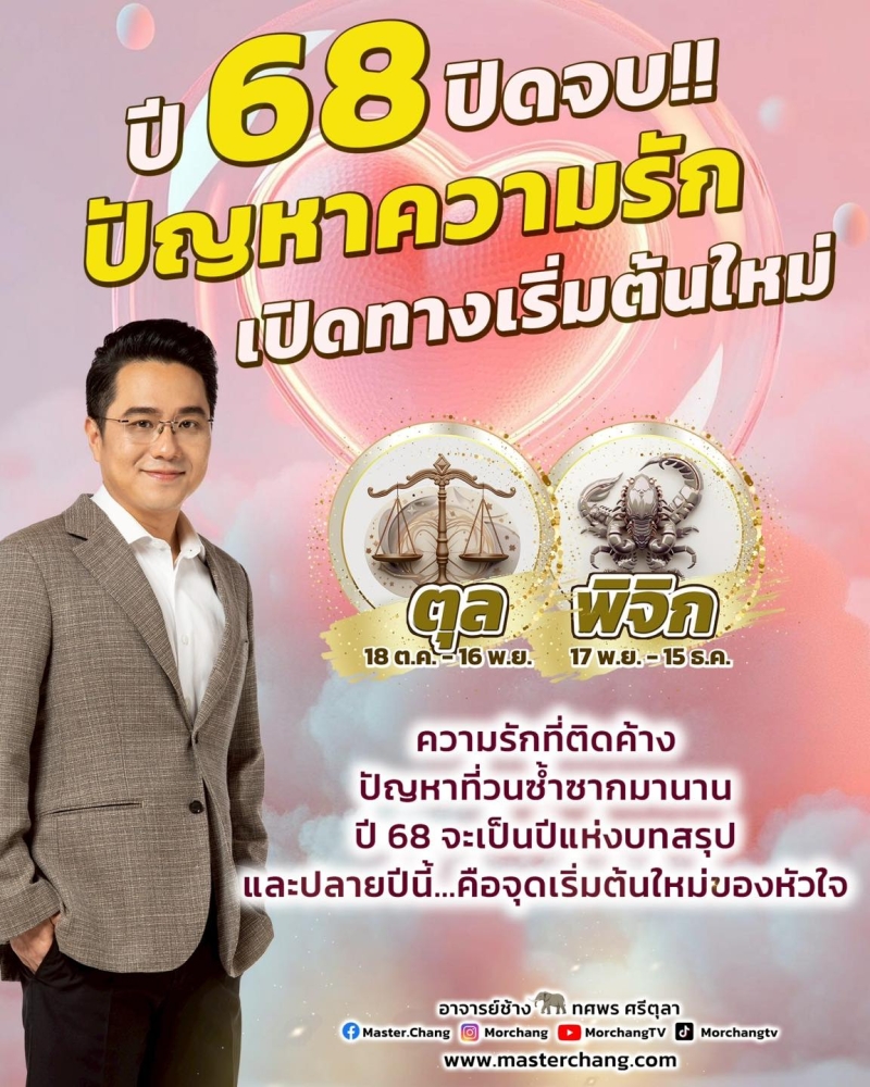 วันที่ 21 ธ.ค. 68 หมอช้าง ทศพร โพสต์ส่งท้ายปีกับ 2 ราศีว่า “ราศี…ปี68ปิดจบปัญหาความรัก เปิดทางเริ่มต้นใหม่” ความรักที่ติดค้าง ปัญหาที่วนซ้ำซากมานาน ปี68 จะเป็นปีแห่งบทสรุปและปลายปีนี้…คือจุดเริ่มต้นของหัวใจ