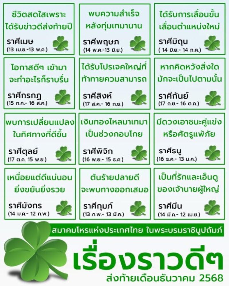วันที่ 22 ธ.ค.68 สมาคมโหรแห่งประเทศไทย ในพระบรมราชินูปถัมภ์ เปิดเผยถึง เรื่องราวดีๆ ของชาว 12 ราศี ส่งท้ายเดือนธันวาคม 2568 ดังนี้