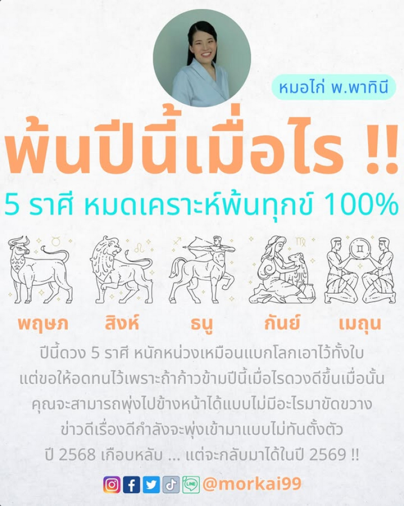 ล่าสุดนักพยากรณ์ดังอย่าง หมอไก่ พ.พาทินี ทำนายดวง 5 ราศี หมดปีนี้เมื่อไหร่ หมดเคราะห์พ้นทุกข์ 100% ข่าวดีเรื่องดีกำลังพุ่งเข้ามาแบบไม่ทันตั้งตัว ข่าวดีเรื่องดีกำลังพุ่งเข้ามาแบบไม่ทันตั้งตัว ปี 2568 เกือบหลับ แต่กลับมาได้ในปี 2569 ซึ่งได้แก่