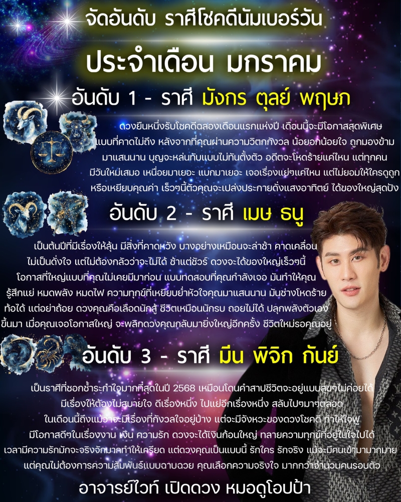 ล่าสุดนักพยากรณ์ดังอย่าง หมอไวท์ ได้ดูดวงเดือนมกราคม 2569 จัดอันดับ ราศีโชคดีนัมเบอร์วัน ประจำเดือนมกราคม ดวงยืนหนึ่งรับโชคดีฉลองเดือนแรกแห่งปี ดวงจะได้ของใหญ่เร็วๆนี้ ได้เงินก้อนใหญ่ ซึ่งมีคำทำนายดังต่อไปนี้