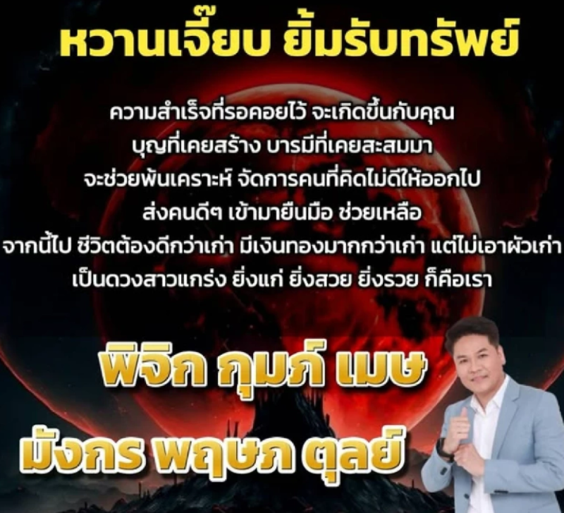 โดย หมอบอย ชี้ว่า ช่วงเวลานี้เหมาะกับคำว่า โชคดีเต็มพิกัด โอกาสที่รอคอยมานาน จะเริ่มเป็นรูปเป็นร่าง พร้อมแรงสนับสนุนจากกรรมดี และความตั้งใจในอดีต ช่วยให้หลายคนหลุดพ้นจากปัญหา และอุปสรรคที่รุมเร้า