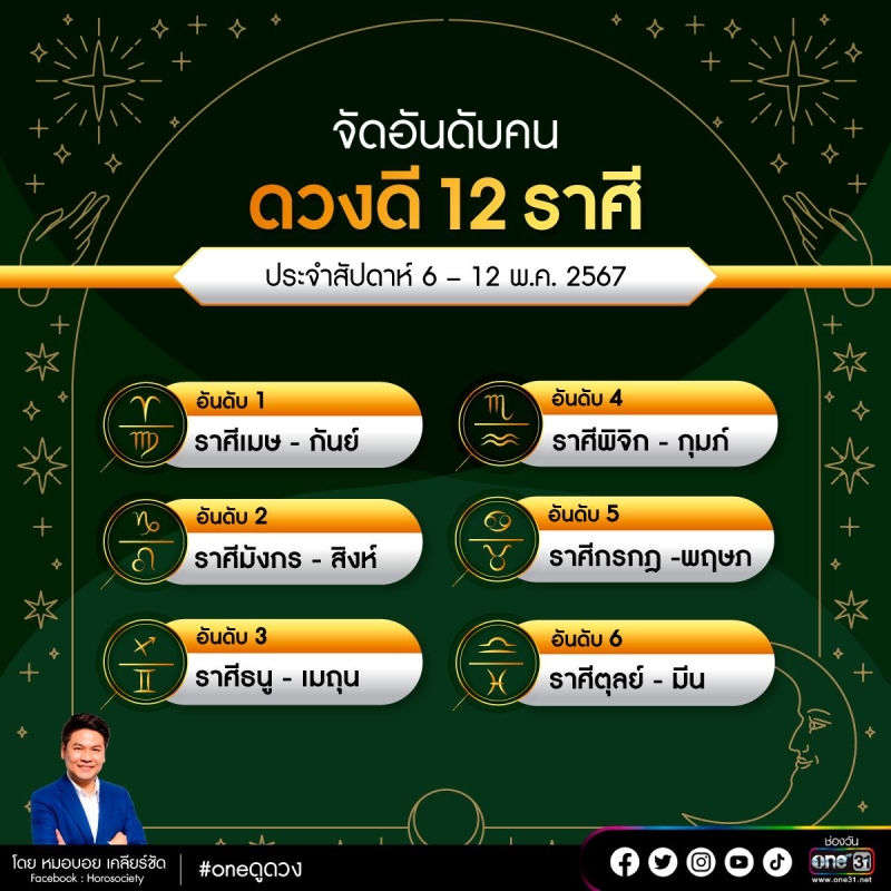 เมื่อวันที่ 7 พ.ค. 67 ที่ผ่านมา หมอบอย เคลียร์ชัด นักดูดวงและราศี เปิดดวงดวงชะตา จัดอันดับคนดวงดี 12 ราศี ประจำสัปดาห์ที่ 6 – 12 พฤษภาคม 2567