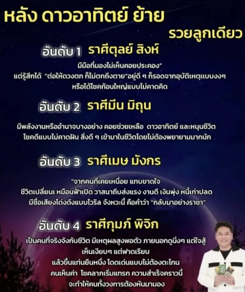 โดย 4 อันดับราศีที่ดวงขึ้นชัดหลังดาวอาทิตย์ย้าย ได้แก่ ราศีเมษ ได้เริ่มต้นใหม่ งานและรายได้ขยับ , ราศีมังกร ดวงหนุนแรง มีคนอุปถัมภ์ , ราศีตุลย์ โชคมาจากการพูดคุย และ ดีลสำคัญ และ ราศีสิงห์ บารมีเด่น ความสำเร็จมาเร็วเกินคาด