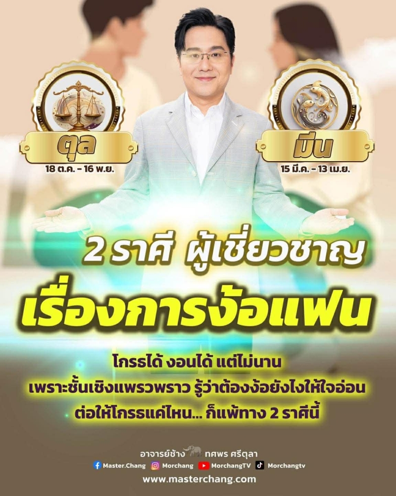 เรียกได้ว่า ดวงความรักรอบนี้ อาจารย์ช้าง ทศพร ศรีตุลา เปิดคำทำนายถึง 2 ราศีที่โดดเด่นเรื่องการง้อแฟน จนขึ้นแท่นตัวท็อปด้านการประสานรอยร้าวของหัวใจ