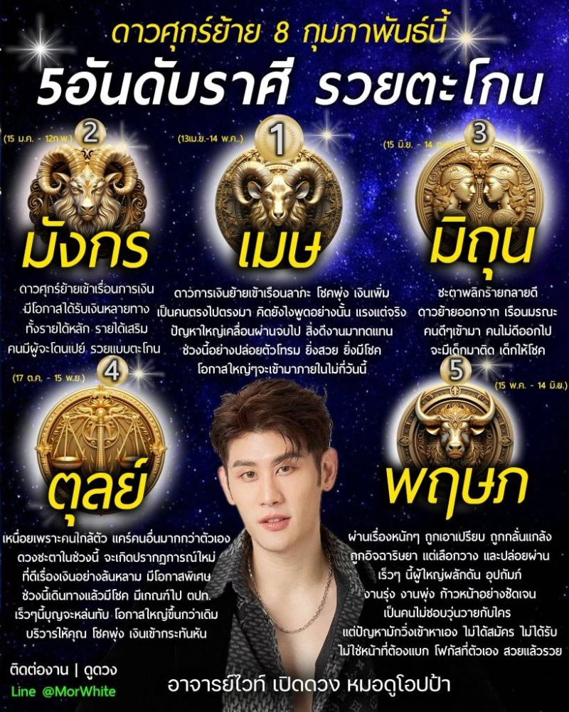 นักพยากรณ์ดังอย่าง หมอไวท์ ดูดวงวันนี้ 5 อันดับราศี รวยตะโกน ดาวศุกร์ย้ายเข้าเรือนการเงิน โชคพุ่ง เงินเพิ่ม ในวันที่ 8 ก.พ. 2569 จะเกิดปรากฏการณ์ ดาวศุกร์ย้าย