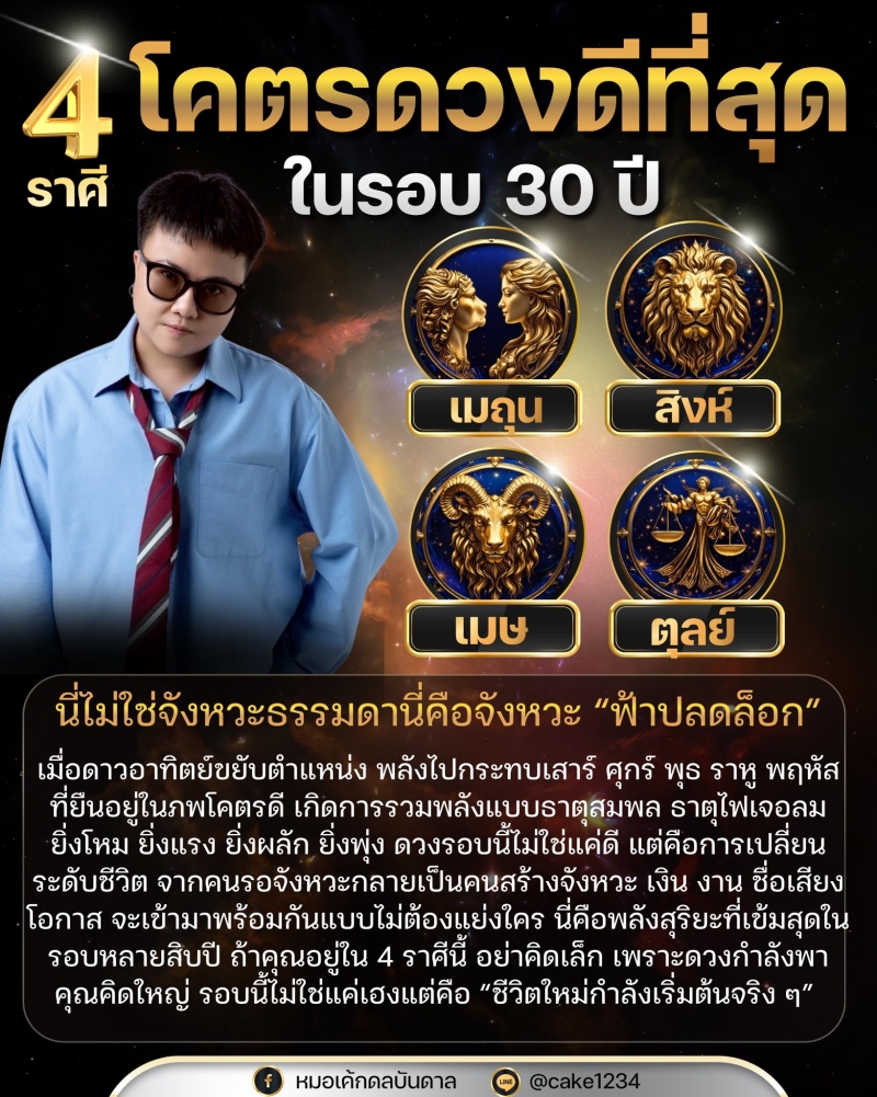 เรียกได้ว่า 4 ราศีที่ถูกยกให้ดวงพุ่งแรงที่สุดในรอบ 30 ปี ได้แก่ เมถุน , สิงห์ , เมษ และ ตุลย์ จังหวะนี้ไม่ใช่แค่เฮงธรรมดา แต่ถูกมองว่าเป็นช่วงฟ้าปลดล็อกครั้งใหญ่ของชีวิต