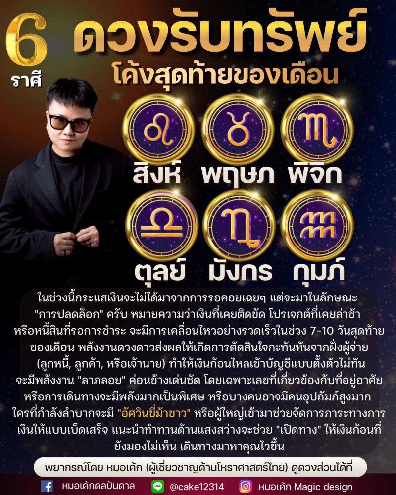 เรียกได้ว่า ช่วงโค้งท้ายเดือนนี้มีสัญญาณข่าวดีด้านการเงินสำหรับ 6 ราศี ตามคำทำนายของ หมอเค้ก ผู้เชี่ยวชาญโหราศาสตร์ไทย ที่ชี้ว่า ดวงการเงินกำลังเข้าสู่จังหวะปลดล็อกแบบกะทันหัน