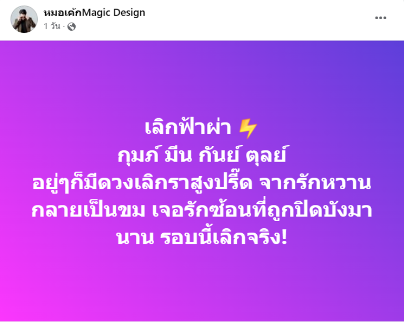 เมื่อวันที่ 16 พ.ค. 67 ที่ผ่านมา ทางเพจเฟซบุ๊ก หมอเค้ก Magic Design หรือที่เรารู้จักกันดีในนามหมอเค้ก หมอดูชื่อดัง ได้โพสต์คำทำนายดวง 4 ราศี เลิกฟ้าผ่า จะมีราศีไหนบ้างไปดูกันเลย
