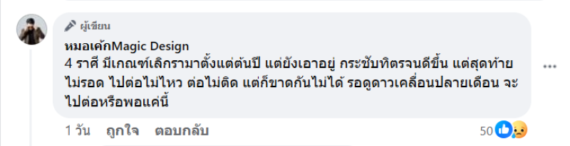 โดย 4 ราศี มีเกณฑ์เลิกรามาตั้งแต่ต้นปี แต่ยังเอาอยู่ กระชับทิตรจนดีขึ้น แต่สุดท้ายไม่รอด ไปต่อไม่ไหว ต่อไม่ติด แต่ก็ขาดกันไม่ได้ รอดูดาวเคลื่อนปลายเดือน จะไปต่อหรือพอแค่นี้