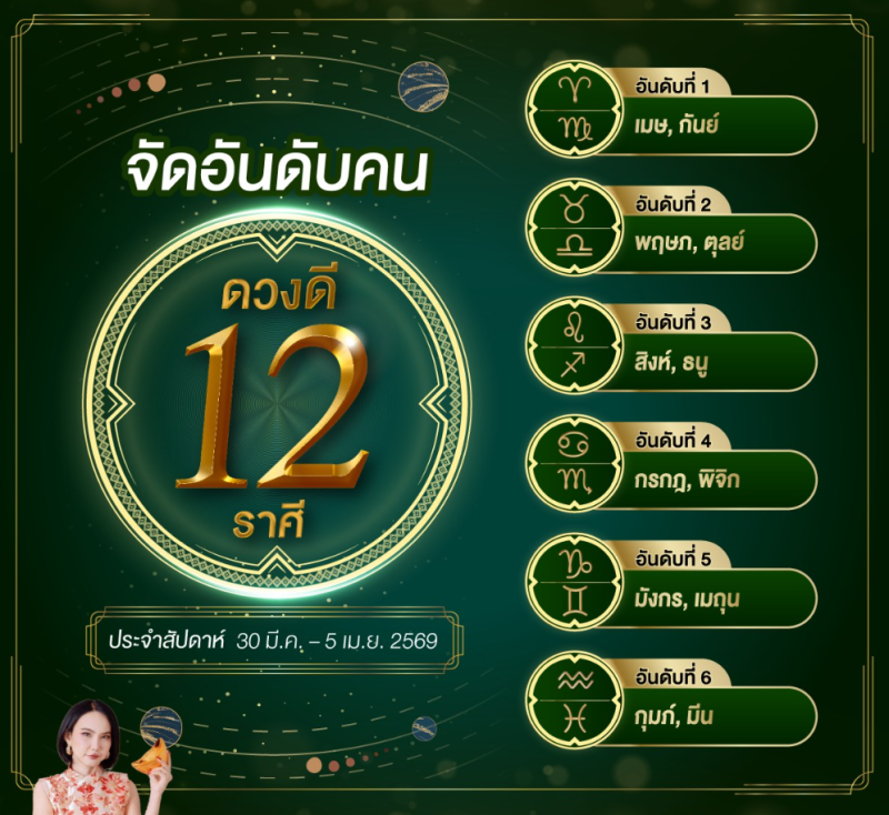 วันที่ 30 เม.ย. 69 ทางเพงดัง Horosociety หมอเชอร์ เป๊ะเว่อร์ นักโหราศาสตร์ชื่อดังและดูดวง จัดอันดับคนดวงดี 12 ราศี ประจำสัปดาห์ 30 มีนาคม – 5 เมษายน 2569 เผยชัดราศีไหนมีเกณฑ์รับโชค งานปัง ความรักรุ่ง การเงินสดใส พร้อมพลังดีหนุนชีวิตให้ก้าวหน้าแบบเป๊ะเว่อร์