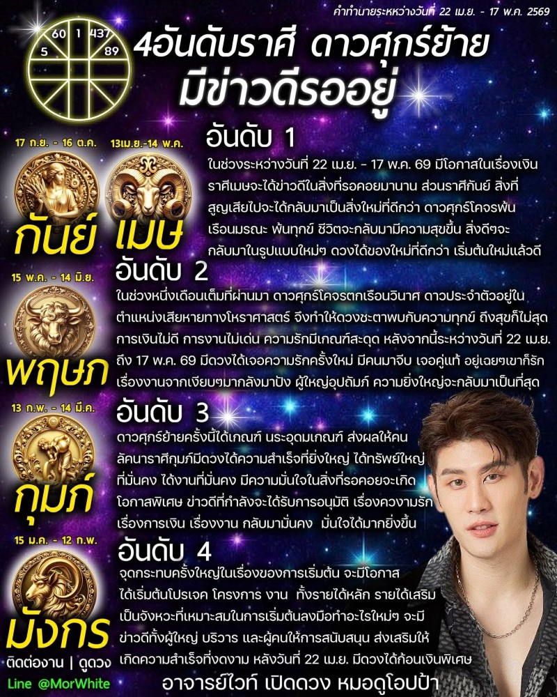 เรียกได้ว่า สายมูมีเฮรับดาวศุกร์ย้าย โดย อาจารย์ไวท์ หมอดูโอปป้า เปิด 4 อันดับราศีดวงพุ่ง มีข่าวดีรออยู่ช่วง 22 เม.ย.-17 พ.ค. 2569 เฉพาะเรื่องการเงิน การงาน และความรัก ที่หลายราศีกำลังเตรียมพลิกจากร้ายกลายเป็นปัง