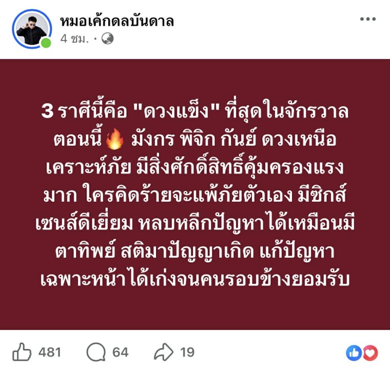 เรียกได้ว่า ดวงมาแรงแบบฉุดไม่อยู่ สำหรับ 3 ราศีที่ถูกยกให้เป็น ดวงแข็ง ที่สุดในช่วงนี้ ได้แก่ มังกร พิจิก และ กันย์ เพราะมีเกณฑ์เหนือเคราะห์ภัย ปัญหาหนักมีแนวโน้มคลี่คลาย และเหมือนมีพลังคุ้มครองหนุนอยู่ตลอดเวลา