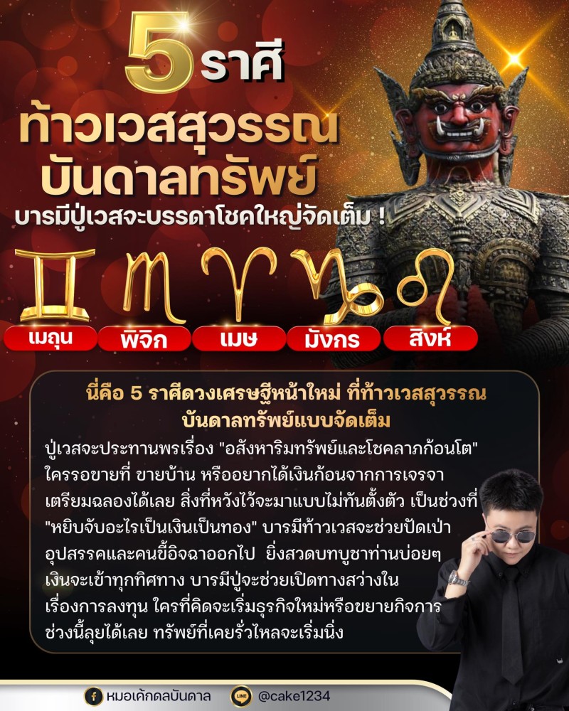 นี่คือ 5 ราศีดวงเศรษฐีหน้าใหม่ ที่ท้าวเวสสุวรรณ บันดาลทรัพย์แบบจัดเต็ม ปู่เวสจะประทานพรเรื่อง "อสังหาริมทรัพย์และโชคลาภก้อนโต" ใครรอขายที่ ขายบ้าน หรืออยากได้เงินก้อนจากการเจรจา เตรียมฉลองได้เลย สิ่งที่หวังไว้จะมาแบบไม่ทันตั้งตัว เป็นช่วงที่ "หยิบจับอะไรเป็นเงินเป็นทอง" บารมีท้าวเวสจะช่วยปัดเป่า อุปสรรคและคนขี้อิจฉาออกไป ยิ่งสวดบทบูชาท่านบ่อยๆ เงินจะเข้าทุกทิศทาง บารมีปู่จะช่วยเปิดทางสว่างใน เรื่องการลงทุน ใครที่คิดจะเริ่มธุรกิจใหม่หรือขยายกิจการ ช่วงนี้ลุยได้เลย ทรัพย์ที่เคยรั่วไหลจะเริ่มนิ่ง