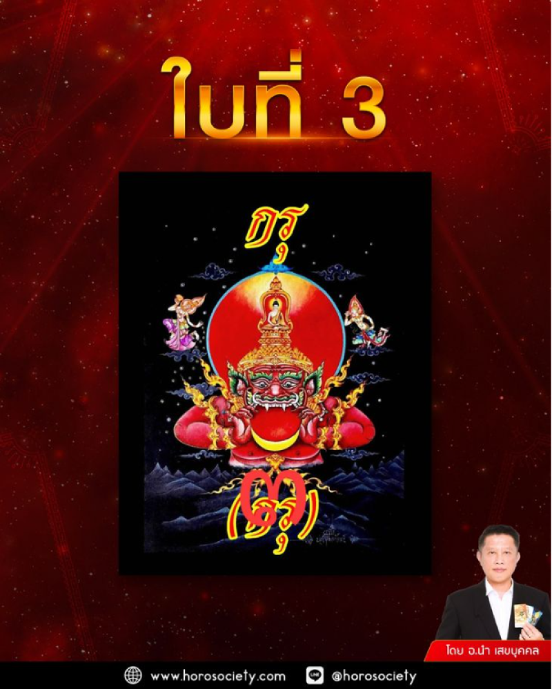 ใบที่ 3 ให้คุณทำบุญเกี่ยวกับการช่วยเหลือสังคม เป็นจิตอาสา บริจาคอุปกรณ์การแพทย์หรือเครื่องมือแพทย์ เช่นแขนเทียมขาเทียม ปลูกป่า ช่วยเหลือคนป่วยคนพิการ อานิสงส์จะช่วยทำให้คุณพ้นจากอุปสรรคอันตราย และความอึดอัดขัดข้องขัดเคืองขัดสน