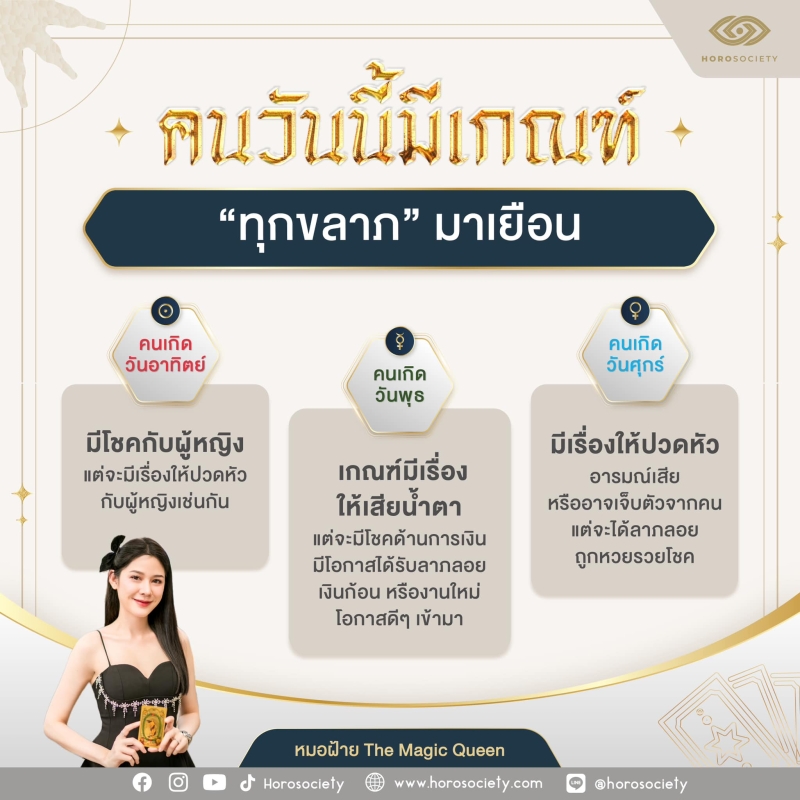 วันที่ 13 มิ.ย. 67 ทาง หมอฝ้าย The Magic Queen ได้ออกมาทำนาย 3 วันเกิด ช่วงนี้มีโชคแต่ก็จะมีเรื่องไม่ค่อยดีมาพร้อมกัน โบราณว่าเป็นทุกขลาภ เป็นคนเกิดวันไหนบ้างไปดูกัน