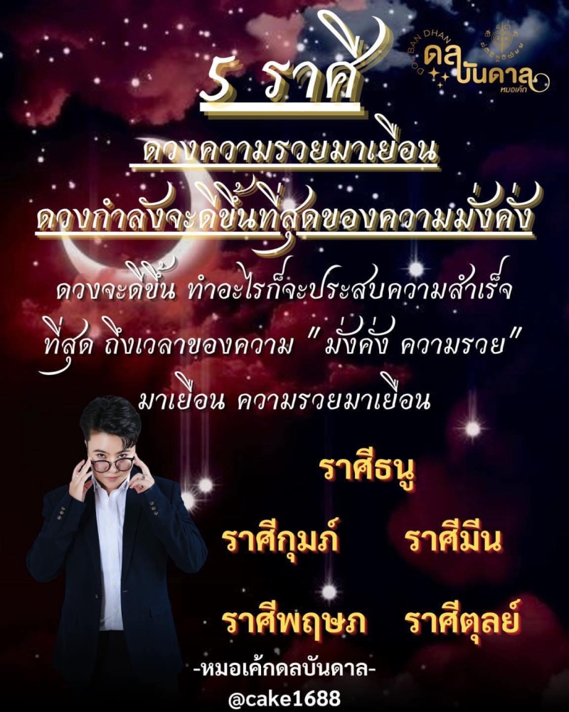 จากกรณีเพจเฟซบุ๊ก Cake The Magic โดยได้ทำนายไว้ดังนี้ 5 ราศีดวงความรวยมาเยือน ดวงกำลังจะดีขึ้นที่สุดของความมั่งคั่ง ดวงจะดีขึ้น ทำอะไรก็จะประสบความสำเร็จที่สุด ถึงเวลาของความมั่งคั่ง ความรวยมาเยือน