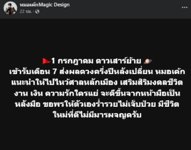 ด้าน หมอเค้ก Magic Design หมอดูชื่อดัง ผู้เชี่ยวชาญด้านโหราศาสตร์ดวงดาว เผยคำทำนายเกี่ยวกับ ดาวเสาร์ย้าย เข้าสู่เดือนกรกฎาคม ระบุว่า 1 กรกฎาคม ดาวเสาร์ย้าย เข้ารับเดือน 7 ส่งผลดวงครึ่งปีหลังเปลี่ยน แนะนำให้ไปไหว้ศาลหลักเมือง เสริมสิริมงคลชีวิต การงาน การเงิน ความรักใครแย่ จะดีขึ้นจากหน้ามือเป็นหลังมือ ขอพรให้ตัวเองร่ำรวยไม่เจ็บป่วย มีชีวิตใหม่ที่ดีไม่มีมารผจญครับ