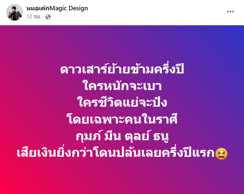 เมื่อวันที่ 30 มิ.ย. 67 ที่ผ่านมา ทางเพจเฟซบุ๊ก หมอเค้ก Magic Design หรือที่เรารู้จักกันดีในนามหมอเค้ก หมอดูชื่อดัง ได้โพสต์คำทำนายดวง ดาวเสาร์ย้ายข้ามครึ่งปี ใครหนักจะเบา ใครชีวิตแย่จะปัง โดยเฉพาะคนในราศี