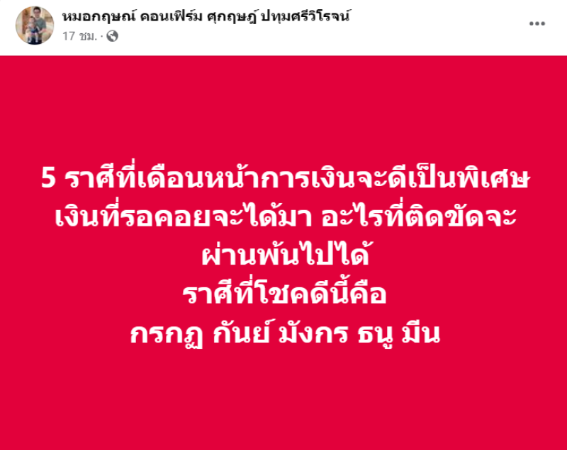 วันที่ 2 ก.ค. 67 ที่ผ่านมา หมอกฤษณ์ ศุกฤษฎ์ ปทุมศรีวิโรจน์ นักโหราศาสตร์ชื่อดัง อันดับต้นๆของประเทศ ได้ออกมาทำนายดวงชะตา 5 ราศี ที่เดือนหน้าการเงินจะดีเป็นพิเศษ เงินที่รอคอยจะได้มา อะไรที่ติดขัดจะผ่านพ้นไปได้