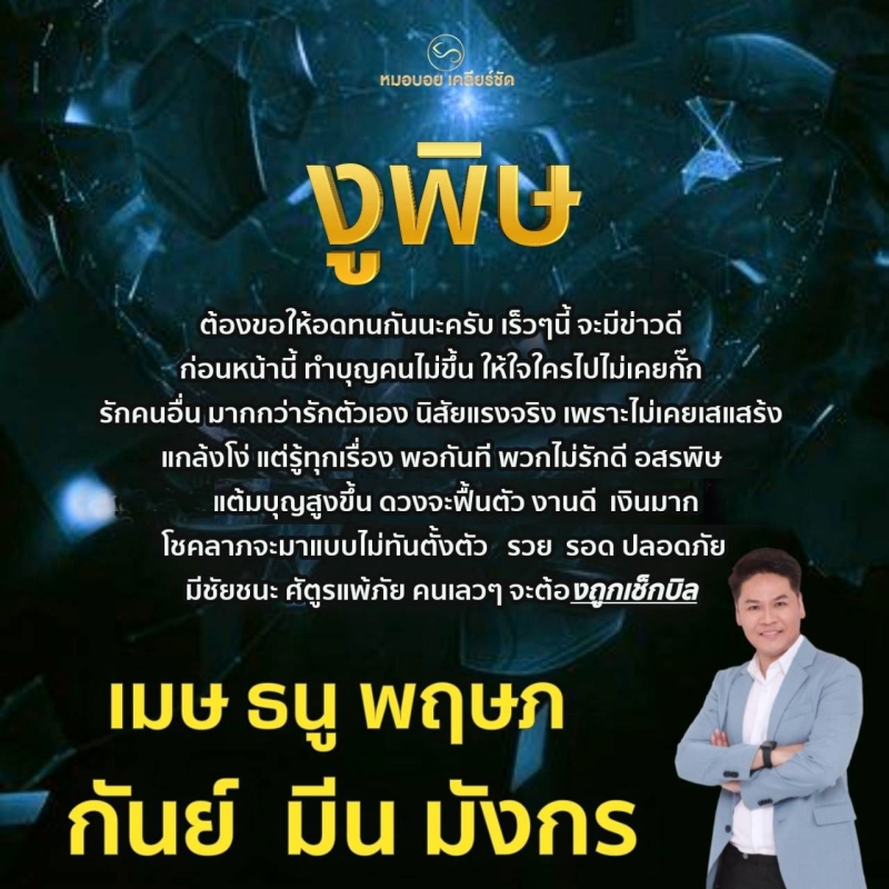 ต้องขอให้อดทนกันนะครับ เร็วๆนี้ จะมีข่าวดี ก่อนหน้านี้ ทําบุญคนไม่ขึ้น ให้ใจใครไปไม่เคยก็ก รักคนอื่น มากกว่ารักตัวเอง นิสัยแรงจริง เพราะไม่เคยเสแสร้ง แกล้งโง่ แต่รู้ทุกเรื่อง พอกันที พวกไม่รักดี อสรพิษ แต้มบุญสูงขึ้น ดวงจะฟื้นตัว งานดี เงินมาก โชคลาภจะมาแบบไม่ทันตั้งตัว รวย รอด ปลอดภัย มีชัยชนะ ศัตรแพ้ภัย คนเลวๆ จะต้องถูกเช็กบิล