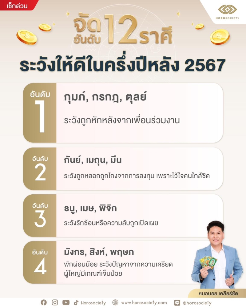 เมื่อวันที่ 26 ก.ค. 67 ที่ผ่านมา ทางเพจ Horosociety โดย หมอบอย เคลียร์ชัด นักดูดวงและราศี ได้รจัดอันดับ 12 ราศี ระวังให้ดีในครึ่งปีหลัง 2567