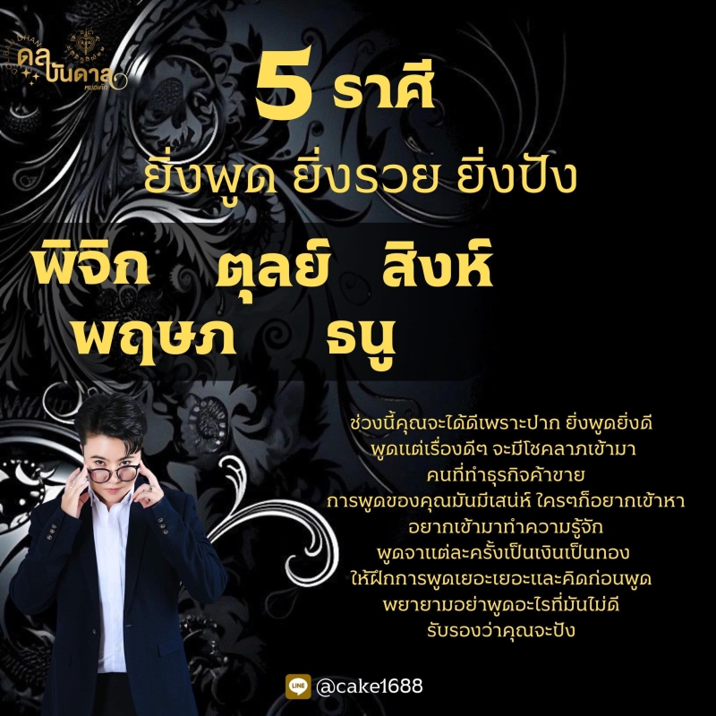 หมอเค้ก เผยในเพจ Cake The magic ถึง ดวงชะตา 5 ราศี ยิ่งพูดยิ่งรวยยิ่งปัง ช่วงนี้คุณจะได้ดีเพราะปาก ยิ่งพูดยิ่งดี พูดแต่เรื่องดีๆ จะมีโชคลาภเข้ามา คนที่ทำธุรกิจค้าขาย การพูดของคุณมีเสน่ห์ ใครๆ ก็อยากเข้าหา อยากเข้ามาทำความรู้จัก พูดจาแต่ละครั้งเป็นเงินเป็นทอง ให้ฝึกการพูดเยอะๆ และคิดก่อนพูด พยายามอย่าพูดอะไรที่ไม่ดี รับรองคุณจะปัง