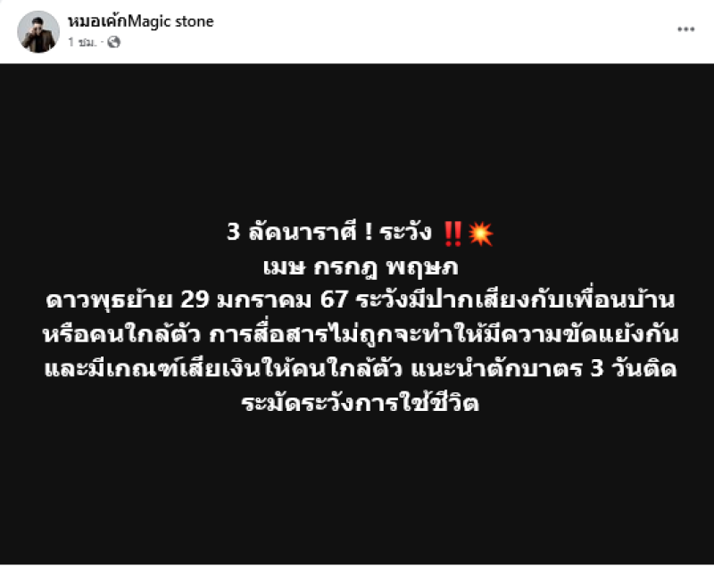 จากกรณีหมอดูชื่อดังอย่าง หมอเค้ก ได้ออกมาเผยผ่าน หมอเค้ก Magic stone 3 ลัคนาราศี ระวัง ดาวพุธย้าย 29 มกราคม 67 ระวังมีปากเสียงกับเพื่อนบ้านหรือคนใกล้ตัว การสื่อสารไม่ถูกจะทำให้มีความขัดแย้งกัน และมีเกณฑ์เสียเงินให้คนใกล้ตัว แนะนำตักบาตร 3 วันติด ระมัดระวังการใช้ชีวิต
