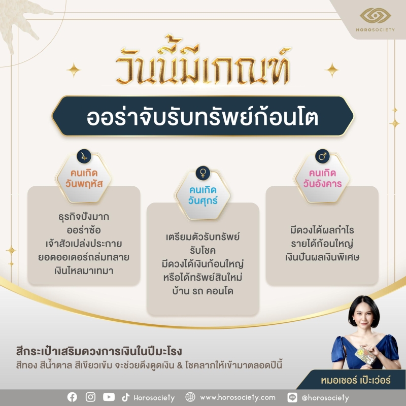 วันที่ 31 ม.ค. 67 Horosociety หมอเชอร์ เป๊ะเว่อร์ นักโหราศาสตร์ชื่อดังและดูดวง ได้ทำนาย 3 วันเกิด ช่วงนี้ออร่าเจ้าสัวจับ พร้อมสีกระเป๋าเสริมดวงให้เงินเข้าแบบไหลมาเทมาเลย