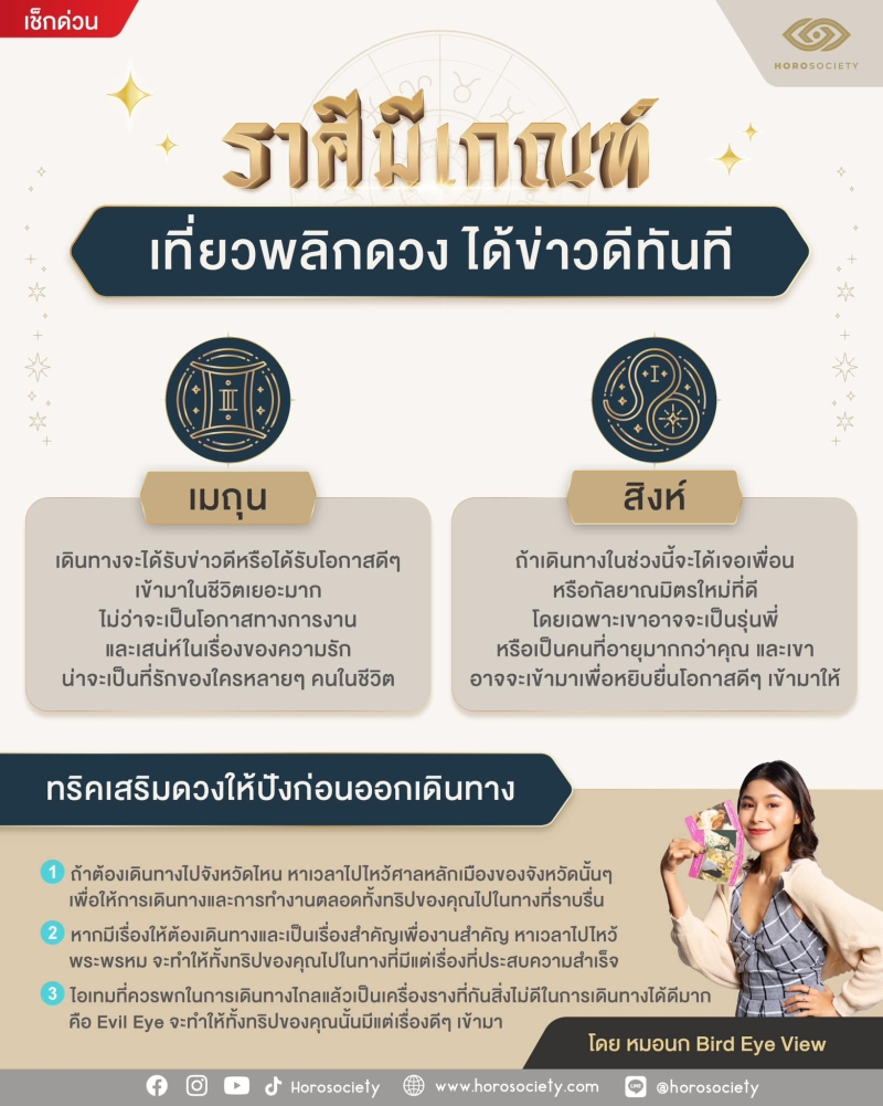 สิงห์ ถ้าเดินทางในช่วงนี้จะได้เจอเพื่อน หรือกัลยาณมิตรใหม่ที่ดี โดยเฉพาะเขาอาจจะเป็นรุ่นพี่ หรือเป็นคนที่อายุมากกว่าคุณ และเงา อาจจะเข้ามาเพื่อหยิบยื่นโอกาสดีๆ เข้ามาให้