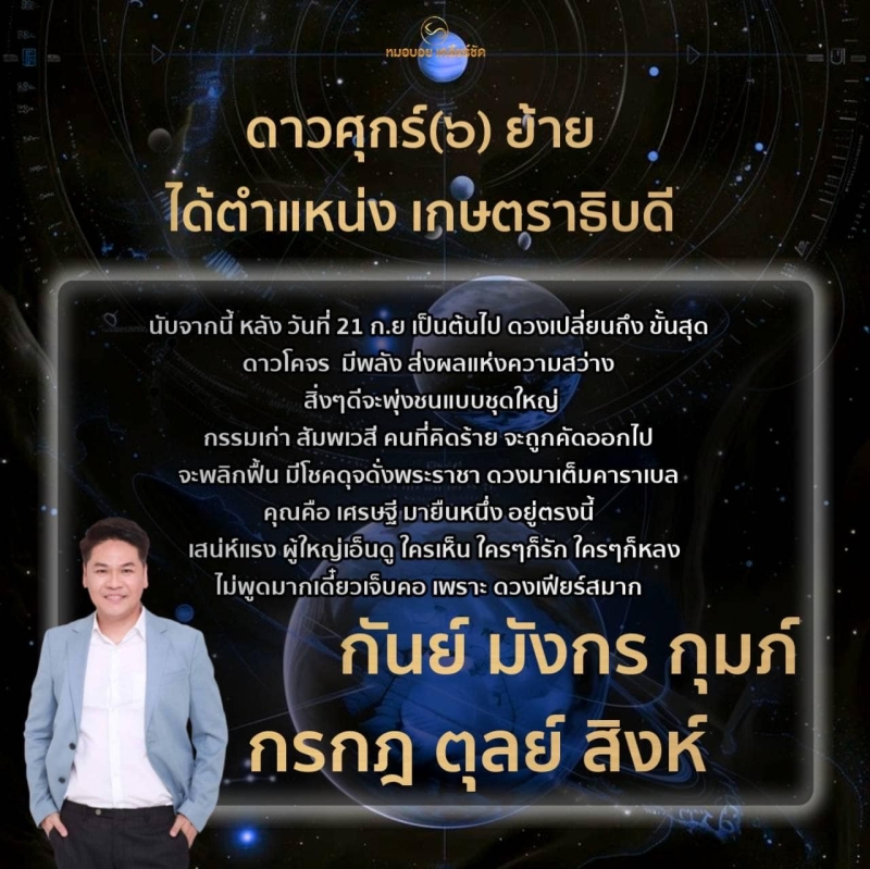 วันที่ 25 ก.ย. 67 ที่ผ่านมา ทางหมอบอย เคลียร์ชัด นักดูดวงและราศี ได้ทำนาย 6ราศี ดาวศุกร์ย้าย ได้ตำแหน่ง เกษตราธิบดี กันย์ มังกร กุมภ์ กรกฎ ตุลย์ สิงห์
