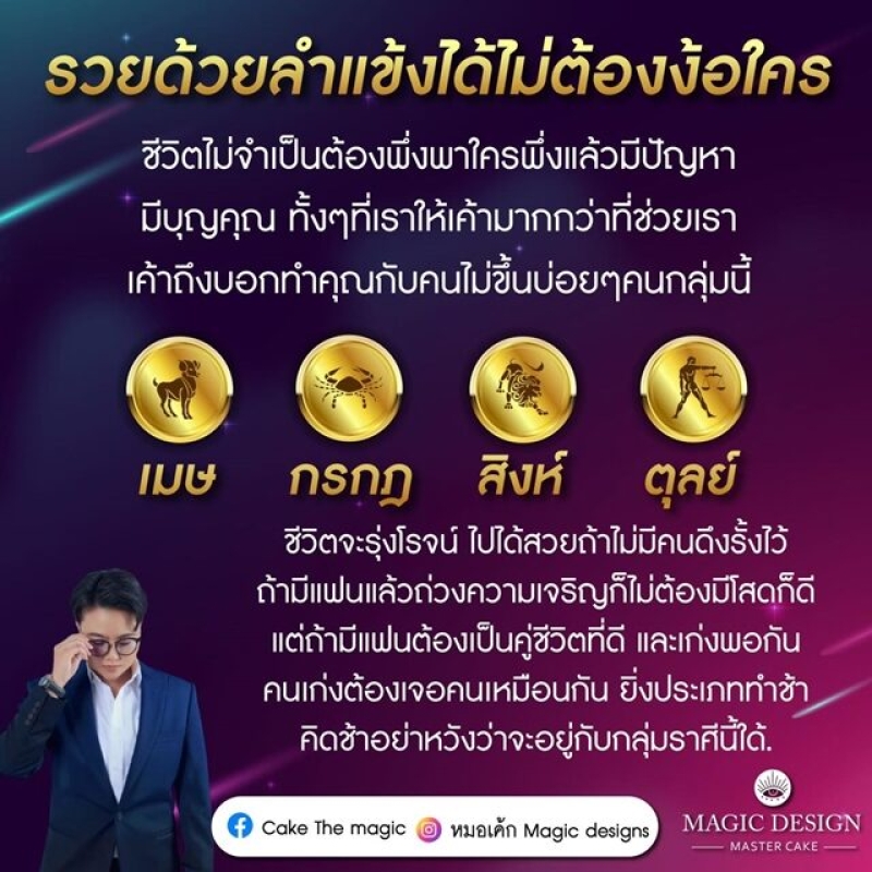 หมอเค้ก Magic stone เปิดดวงชะตา 4 ราศี ชีวิตไม่จำเป็นต้องพึ่งพาใคร พึ่งพาแล้วมีปัญหา มีบุญคุณ ทั้งๆ ที่เราให้เขามากกว่าที่ช่วยเรา เขาถึงบอกทำคุณกับคนไม่ขึ้นบ่อยๆ คนกลุ่มนี้ ชีวิตจะรุ่งโรจน์ ไปได้สวยถ้าไม่มีคนดึงรั้งไว้ ถ้ามีแฟนแล้วถ่วงความเจริญก็ไม่ต้องมี โสดก็ดี แต่ถ้ามีแฟนต้องเป็นคู่ชีวิตที่ดี และเก่งพอกัน คนเก่งต้องเจอคนเหมือนกัน ยิ่งประเภททำช้า คิดช้า อย่าหวังว่าจะอยู่กับกลุ่มราศีนี้ได้
