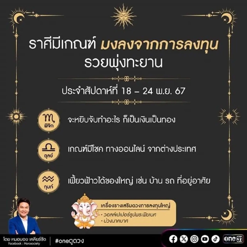 หมอบอย เคลียร์ชัด เปิดดวงชะตาราศีมีเกณฑ์มงลงจากการลงทุน รวยพุ่งทะยาน ประจำสัปดาห์ที่ 18-24 พ.ย.2567 ประกอบด้วย 3 ราศี คือ ราศีพิจิก ราศีตุลย์ และ ราศีกุมภ์ โดยมีรายละเอียดของแต่ละราศี ดังนี้