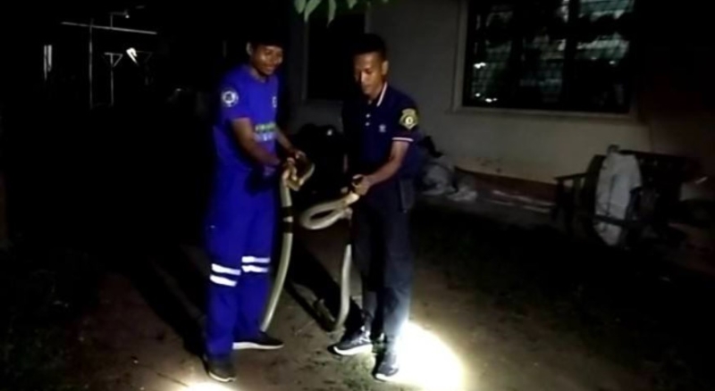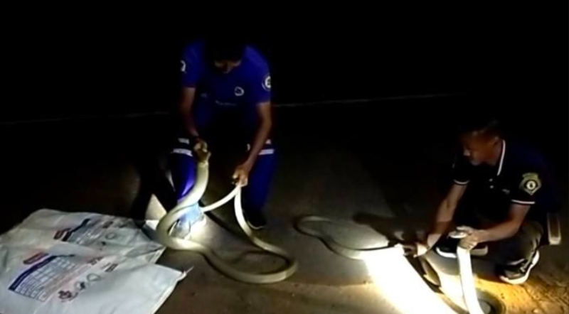 ไม่นานก็สามารถจับงูจงอางตัวใหญ่ทั้งสองตัวไว้ได้ นำมาวัดได้ความยาว ตัวแรกยาวถึง 3.05 เมตร และตัวที่ 2 วัดได้ความยาว 3.35 เมตร จึงรีบนำใส่กระสอบ ไปปล่อยคืนสู่ป่าธรรมชาติที่อยู่ห่างไกลบ้านเรือนของผู้คนต่อไปเพื่อความปลอดภัย