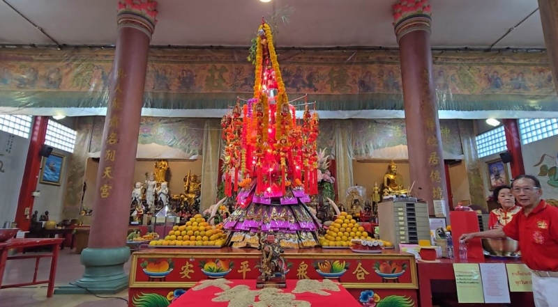เมื่อวันที่ (23 ม.ค.68) ผู้สื่อข่าวรายงานว่า ที่ศาลเจ้าซาไท้จื้อเอี๊ยะกง ต.บ้านปรก อ.เมือง จ.สมุทรสงคราม องค์เทพเจ้านาจาซาไท้จื้อเอี๊ยะกง ได้นำศิษยานุศิษย์ทั้งชาวจีน และชาวไทยเชื้อสายจีน ร่วมสวดมนต์บูชาสิ่งศักดิ์สิทธิ์ และร่วมกันสร้าง กิมฮวยซัส หรือ ภูเขาดอกไม้สวรรค์ สูง 3 เมตร คล้ายกับเป็นการนำสิ่งของเครื่องใช้ขององค์เทพสุมกันเป็นภูเขาสูงจนถึงสวรรค์ เพื่อส่งเสด็จองค์เทพเจ้านาจาซาไท้จื้อเอี๊ยะกง ขึ้นสวรรค์ในช่วงเทศกาลตรุษจีน เพื่อไปขอพรต่อองค์เง็กเซียนฮ้องเต้ กลับมาประทานพรให้กับลูกศิษย์ทุกคน ในวันที่ 1 กุมภาพันธ์ 2568 นี้