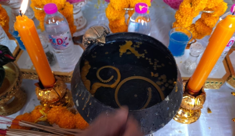 แต่เจ้าของโต๊ะบวงสรวงไม่ได้มาร่วมในพิธี เนื่องจากอยู่ที่ต่างแดน แต่ก็ให้คนทำโต๊ะบวงสรวงส่งภาพทางออนไลน์และไลฟ์สดให้เจ้าของโต๊ะร่วมพิธีบวงสรวงอยู่ในต่างประเทศได้ดู โดยมีพ่อจ้ำประจำลานบวงสรวงคำชะโนดเป็นผู้พานำทำพิธีแล้วเสร็จ สำหรับคนที่ชอบเสี่ยงดวงเสี่ยงโชคพลาดไม่ได้ หลังพิธีบวงสรวงขอพรในวันเกิดโดยการไลฟ์สดแล้ว นางรำคำชะโนดได้ส่องที่ขันน้ำมนต์ไลฟ์สดมองเห็นน้ำตาเทียนเป็นเลข 7-1-6-9 ตามสายตานางรำคำชะโนด ส่วนตัวเลขธูปเสี่ยงโชคมีตัวเลขโผล่มาคือ 712 ,217 เผื่อว่าพ่อปู่แม่ย่าให้โชคในงวดวันที่ 1 มีนาคม นี้