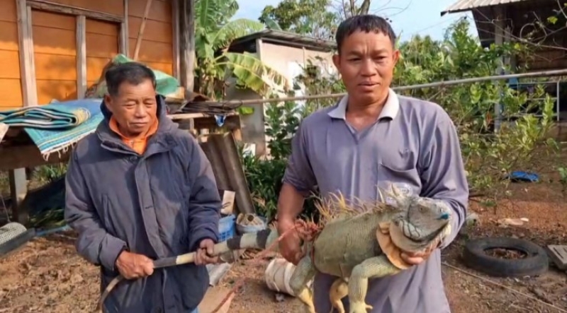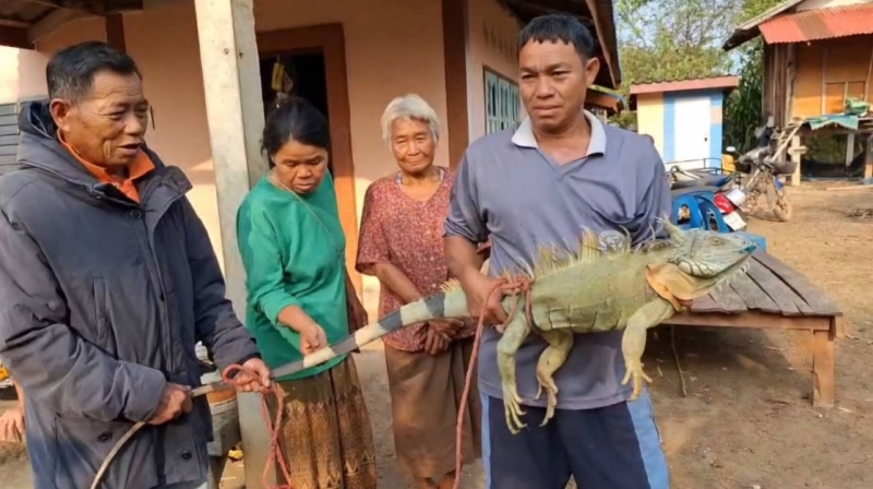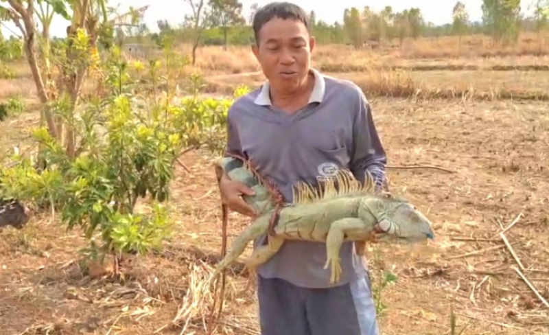 นายประยงค์ เดชสอน อายุ 48 ปี ชาวบ้าน บ.หนองเดิ่น ม.23 ต.บ้านผึ้ง เปิดเผยว่า ขณะนั่งเล่นอยู่ในบ้าน ช่วงเที่ยง พบสิ่งผิดปกติเลื้อยคลานมาริมรั้ว จึงออกไปดูใกล้ขอนไม้ ขณะกำลังคลานมากินน้ำในบ่อ พบสัตว์ประหลาด อีกัวน่ายักษ์ ขณะจะจับมันสู้จึงเรียกเพื่อนบ้าน 4 คนช่วยกันจับ ก่อนจับใส่กระสอบมาเก็บไว้ที่บ้าน เผื่อจะมาให้โชค