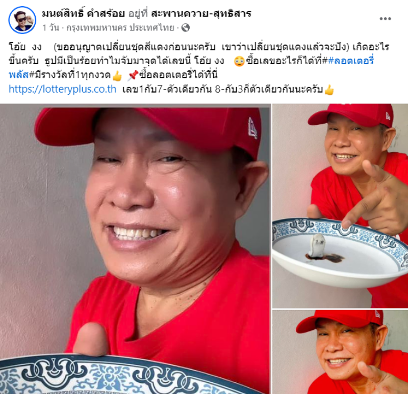 ล่าสุด ด้านมนต์สิทธิ์ คำสร้อย ได้ออกมาเผยโดยได้ระบุข้อความว่า โอ้ย งง (ขออนุญาตเปลี่ยนชุดสีแดงก่อนนะครับ เขาว่าเปลี่ยนชุดแดงแล้วจะปัง) เกิดอะไรขึ้นครับ ธูปมีเป็นร้อยทำไมจับมาจุดได้เลขนี้ โอ้ย งง ซื้อเลขอะไรก็ได้ที่##ลอตเตอรี่พลัส#มีรางวัลที่1ทุกงวด