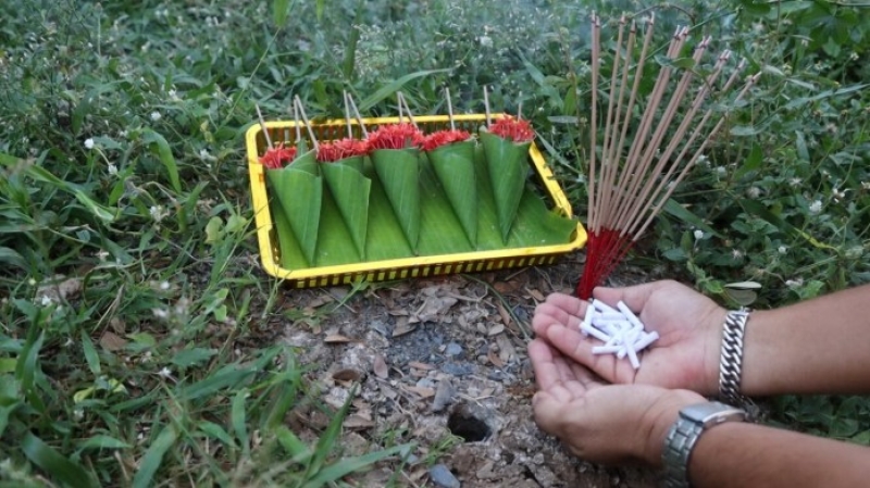 โดยนักเสี่ยงดวงได้นำพานดอกไม้ธูปเทียน และกระดาษเขียนตัวเลข พร้อมทำการจุดธูปบอกเล่า แล้วนำกระดาษที่เขียนตัวเลข 0-9 จำนวน 3 ชุด หย่อนลงไปในรูพญาบึ้ง เพื่อทำการขอตัวเลขเสี่ยงทาย ในช่วงเทศกาลสงกรานต์นี้