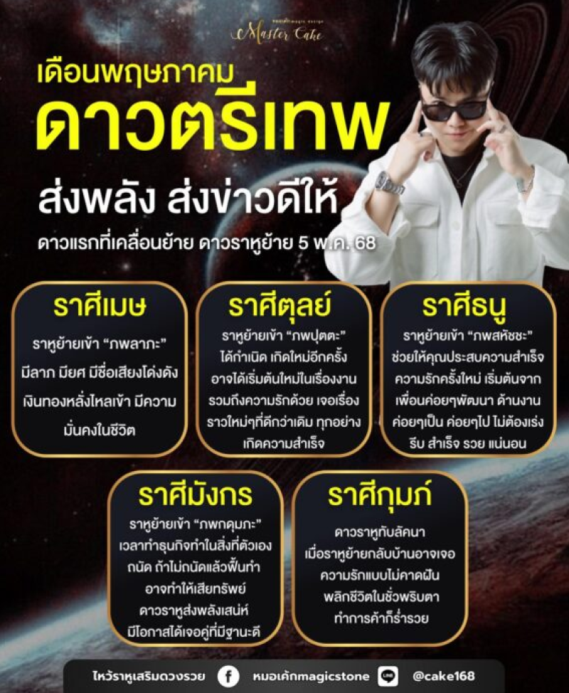 หมอเค้กMagic stone เผยถึงเดือนพฤษภาคมนี้ ดาวตรีเทพ เคลื่อนย้าย ส่งพลัง ส่งข่าวดีให้ทั้ง 5 ราศีนี้ ในด้านไหนบ้าง ดาวแรกที่เคลื่อนย้าย ดาวราหูย้าย วันที่ 5 พ.ค.68 ไหว้พระราหู พลิกดวงชะตาจากเคราะห์ร้ายกลายเป็นดี ลดทอนพลังร้ายทั้งหมด ดึงพลังดีเข้ามาแทน ราหูเหมือนเงามืด ที่ให้กำเนิดแสงสว่างใหม่ ใครได้ไหว้จะเป็นลูกรักของพระราหู