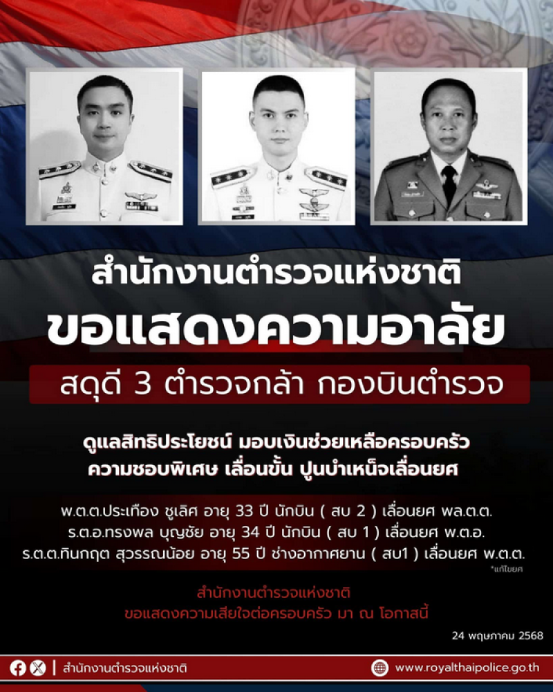 พันตำรวจตรี ประเทือง ชูเลิศ ตำแหน่ง สารวัตร (สอบสวน) กลุ่มงานการบิน กองบังคับการบินตำรวจ ส่วนเจ้าหน้าที่อีกสองนายคือ ร.ต.อ.ทรงพล บุญชัย อายุ 34 ปี ตำแหน่ง นักบิน (สบ 1) กลุ่มงานการบิน กองบินตำรวจ มอบเงินช่วยเหลือเบื้องต้น 1.4 ล้านบาท ปูนบำเหน็จเลื่อนยศเป็น พ.ต.อ. และ ร.ต.ต.ทินกฤต สุวรรณน้อย อายุ 55 ปี ตำแหน่ง ช่างอากาศยาน (สบ1) รอง สว.(อก.) กลุ่มงานช่างอากาศยาน กองบินตำรวจ มอบเงินช่วยเหลือเบื้องต้น 1.9 ล้านบาท ปูนบำเหน็จเลื่อนยศเป็น พ.ต.ต.