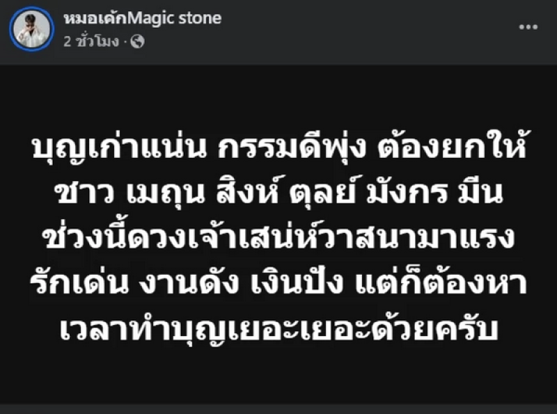 หมอเค้ก Magic stone เปิดดวง 5 ราศีใครๆ ก็อิจฉา งานเด่น เงินปัง รักรุ่ง ถึงเวลาของคุณแล้ว บุญเก่าแน่น กรรมดีพุ่ง ต้องยกให้ชาว ราศีเมถุน ราศีสิงห์ ราศีตุลย์ ราศีมังกร ราศีมีน ช่วงนี้ดวงเจ้าเสน่ห์วาสนามาแรง รักเด่น งานดัง เงินปัง แต่ก็ต้องหาเวลาทำบุญเยอะเยอะด้วยครับ