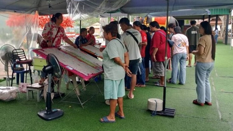 วันที่ 31 พ.ค.2568 ที่วัดเขาช่องลม ต.เขาคันทรง อ.ศรีราชา จ.ชลบุรี ประชาชนจำนวนมากเดินทางมาช่วงวันหยุดก่อนวันออกสลากกินแบ่งรัฐบาล งวดวันที่ 1 มิ.ย.2568 ซึ่งแม้จะมีสายฝนโปรยปรายลงมาแต่ผู้คนก็ยังไม่ย่อท้อ พากันมากราบไหว้บูชาท้าวเวสสุวรรณ(ท่านทองล้น) องค์ใหญ่ ความสูง 9.9 เมตร ตั้งอยู่บริเวณตีนเขา ติดกับพระอุโบสถ