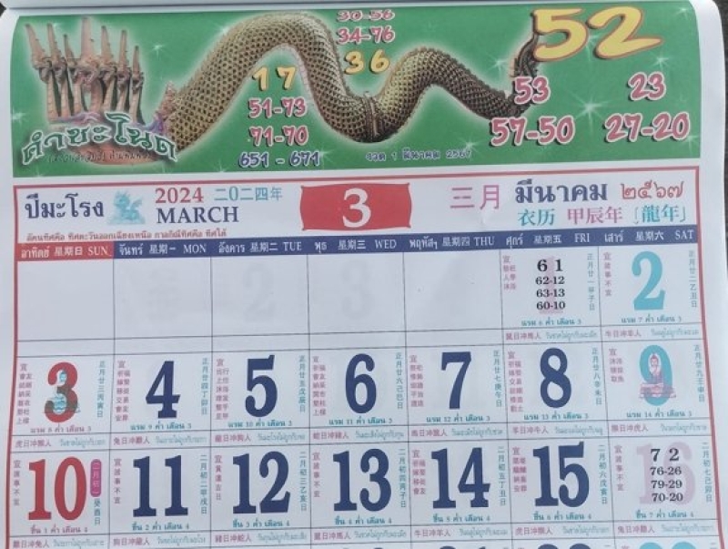 ในส่วนของหัวปฏิทิน เลขเด็ด คำชะโนด เดือนมีนาคม 2567 ประกอบด้วยเลข